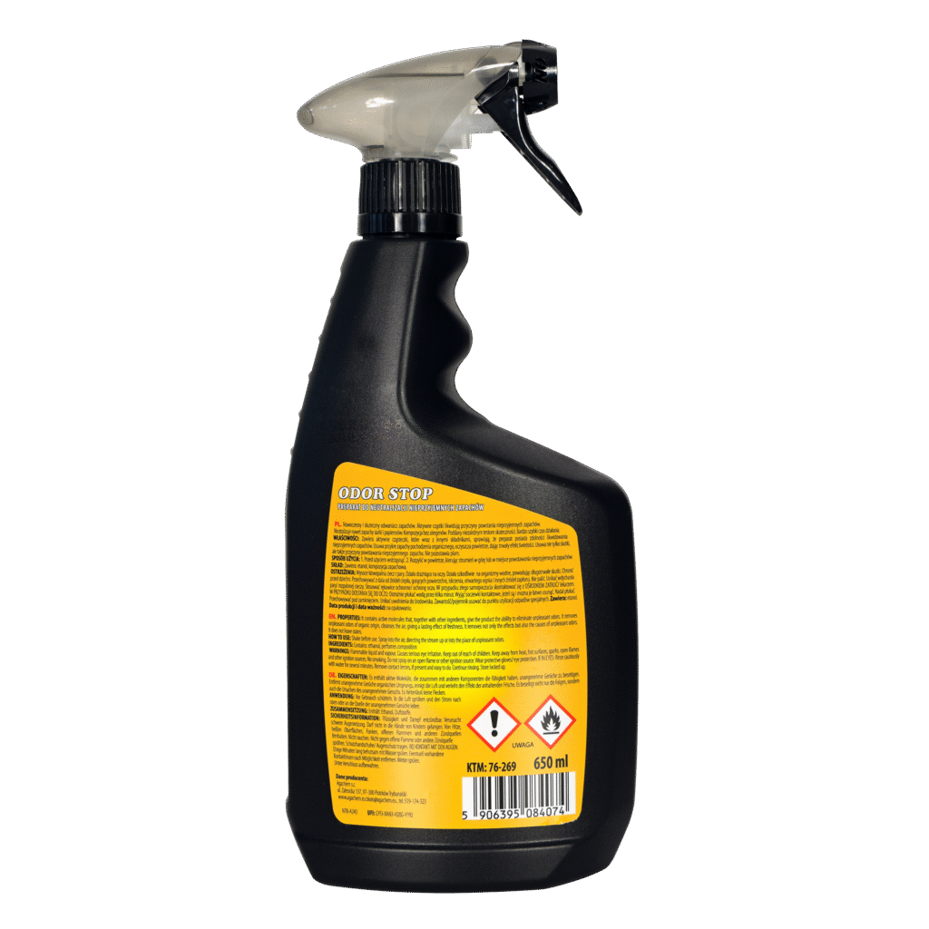 ODOR STOP is a modern and advanced formula for odor neutralization. The product removes unwanted effects occurring in closed environments such as buses, yachts, campervans, as well as other enclosed areas like homes, offices, hotels, and sports clubs.